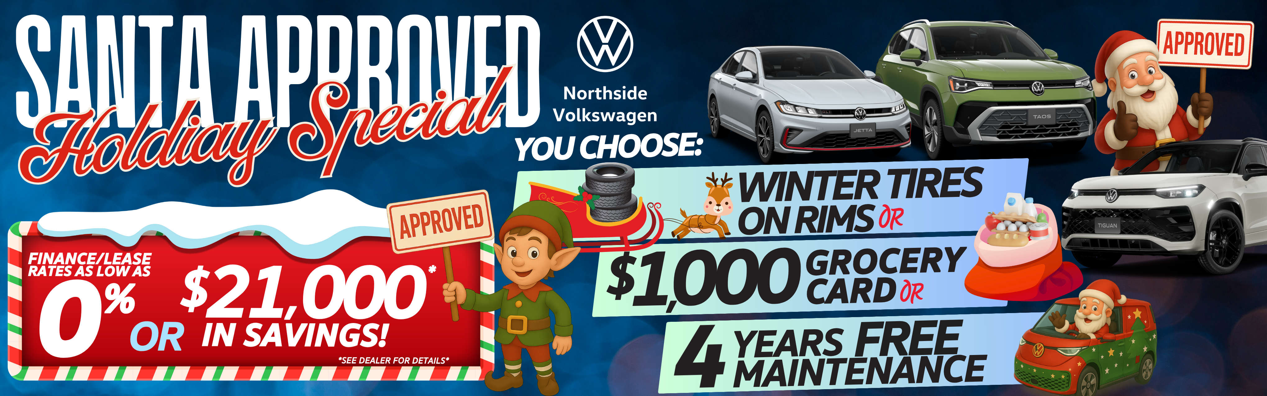 Limited time finance offer available through Volkswagen Financial Services, on approved credit, based on a new and unregistered 2025 ID.4 Electric ID.4 PRO S AWD base model in Ice Grey Metallic (for an additional $500) with single-speed transmission having a cash selling price of $58,908.00, including $68 PPSA registration fee (including third-party registering agent fee), $2,200 freight and PDI, $100 air conditioning levy, $23 tire recycling levy, $22 OMVIC fee, and $500 representative dealer admin fee (actual fee is set by dealers and varies, up to $500), and included in weekly payments. Dealer Administration Fee includes documentation and administration costs related to the delivery of the vehicle, such as the dealer cost involved in licensing, lien search, and contract administration. Dealer may sell for less. Dealer order/trade may be necessary (but may not be available in all cases). Conditions apply. Finance example: 60-month term at 0.00% APR equals a weekly payments of $225, after application of $5,000 credit. $0 down payment or equivalent trade-in due at signing. In Ontario, Volkswagen Group Canada Inc. is responsible for the tire recycling fee used to cover the cost of collecting and recycling end of life tires when returned by consumers. License, insurance, registration, options and applicable taxes are extra. Cost of borrowing is $0 for a total obligation of $58,408. Offers end January 2, 2026 and are subject to change or cancellation without notice. ***$5,000 credit available to be applied as a discount off MSRP, before taxes, with finance purchase (through Volkswagen Financial Services on approved credit) of new and unregistered 2025 ID.4 ID.4 PRO S AWD models. Conditions apply. Offers end January 2, 2026 and are subject to change or cancellation without notice. Visit vwoffers.ca or your Volkswagen dealer for details. “Volkswagen,” the Volkswagen logo, all model names and trimline names are registered trademarks or trademarks of Volkswagen AG, used under license. © 2025 Volkswagen Canada.